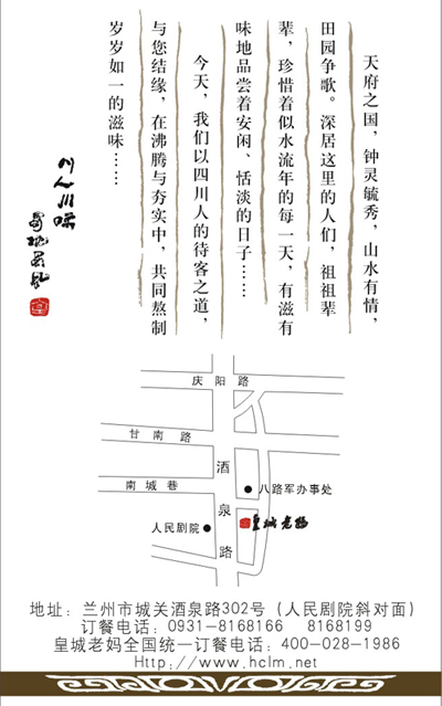 兰州店地处兰州市中心黄金地段城关区白银路,建筑面积逾3000平米,以蜀汉遗风为主的装饰风格,既温暖和谐又古朴沉稳,富于层次和变化,加之有机的结合了典型的汉代图案和各种古器具雕刻、雕塑、字画、摄影精品等,营造出典雅而厚重的蜀汉文化氛围。既传统又现代的大厅和普通包间、行政包间、豪华包间,能同时满足四百多人不同需求的就餐要求。皇城老妈在历年的发展中,践行“重品质、重健康、重信誉”的经营理念,以食材的品质与健康为根本,追求口味享受之上的火锅滋养之道。同时,在产品制作、造型设计上,处处表达了皇城老妈对美食美味的理解。必将给兰州人民带来全新的美食感受。